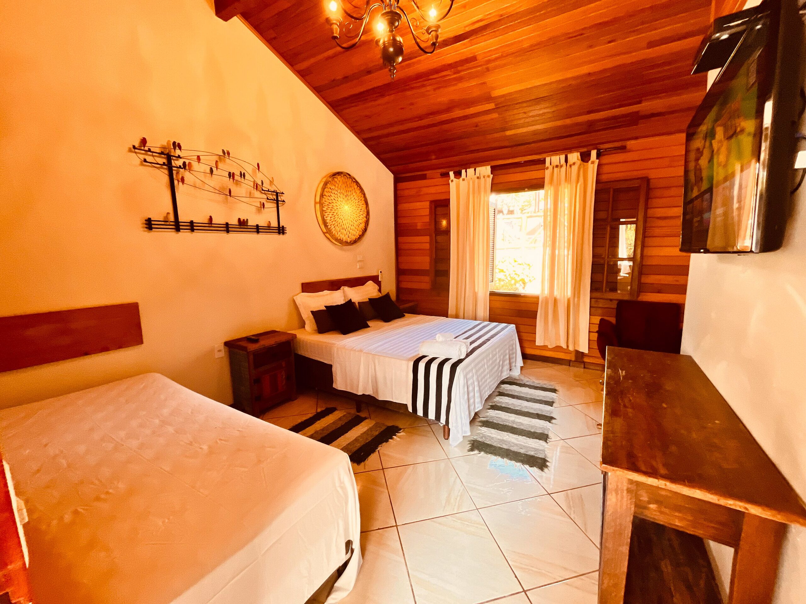 A Suíte Premium oferece uma experiência de hospedagem de luxo. Equipadas com ar-condicionado, TV, Wi-Fi, frigobar e uma cama Queen size, nossas suítes Master destacam-se pela hidromassagem, perfeita para momentos de relaxamento. A decoração elegante e o banheiro com aquecimento solar garantem um ambiente confortável e acolhedor.